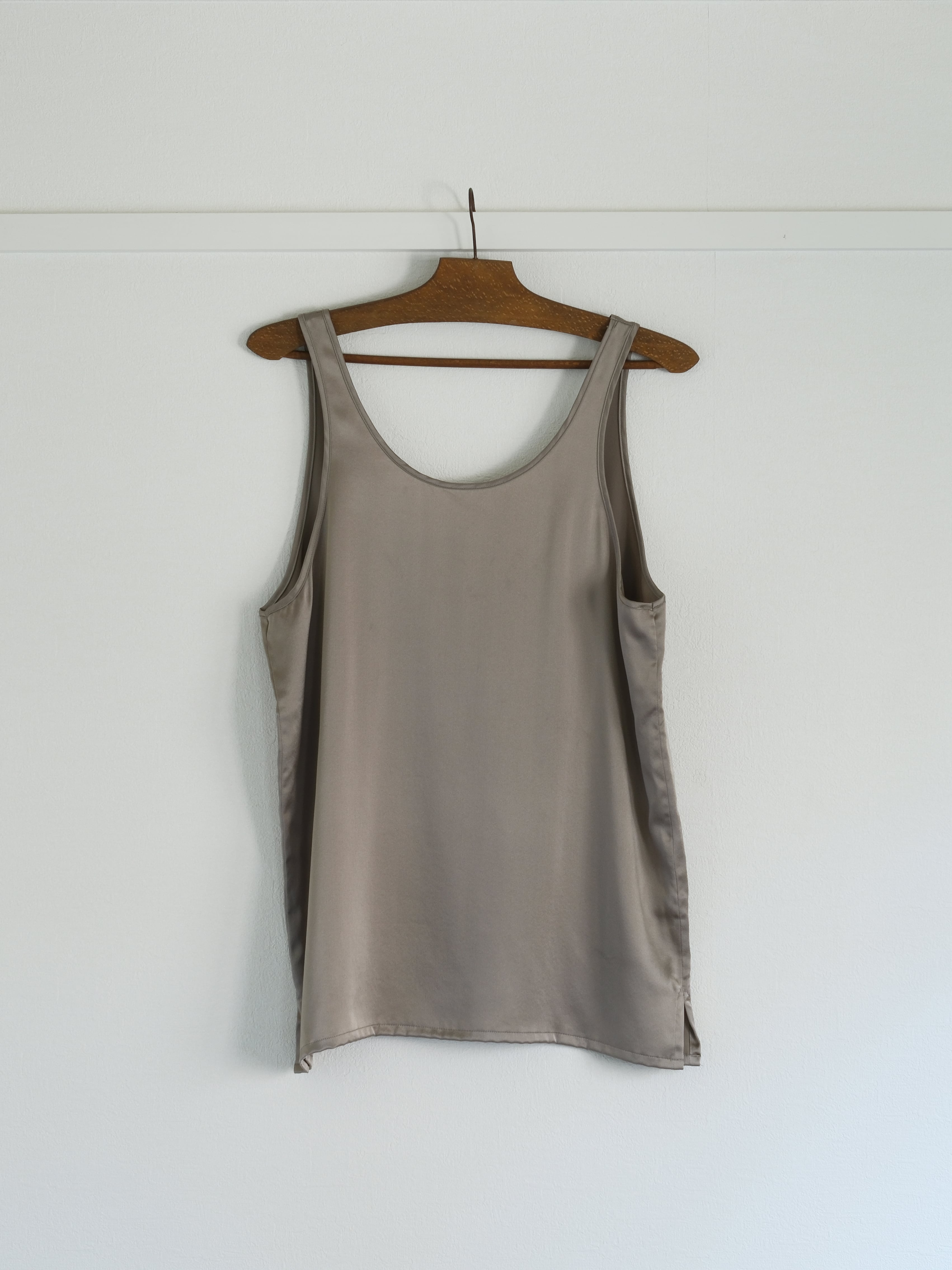 The unefig. tank top is designed to be worn both as an inner layer and as a standalone top. We have added small slits to the left and right hem to serve as a subtle design accent when worn untucked over bottoms. Additionally, the body length is generous enough to ensure it stays securely in place when tucked in.