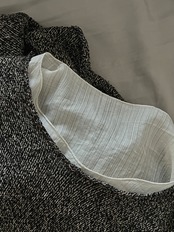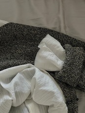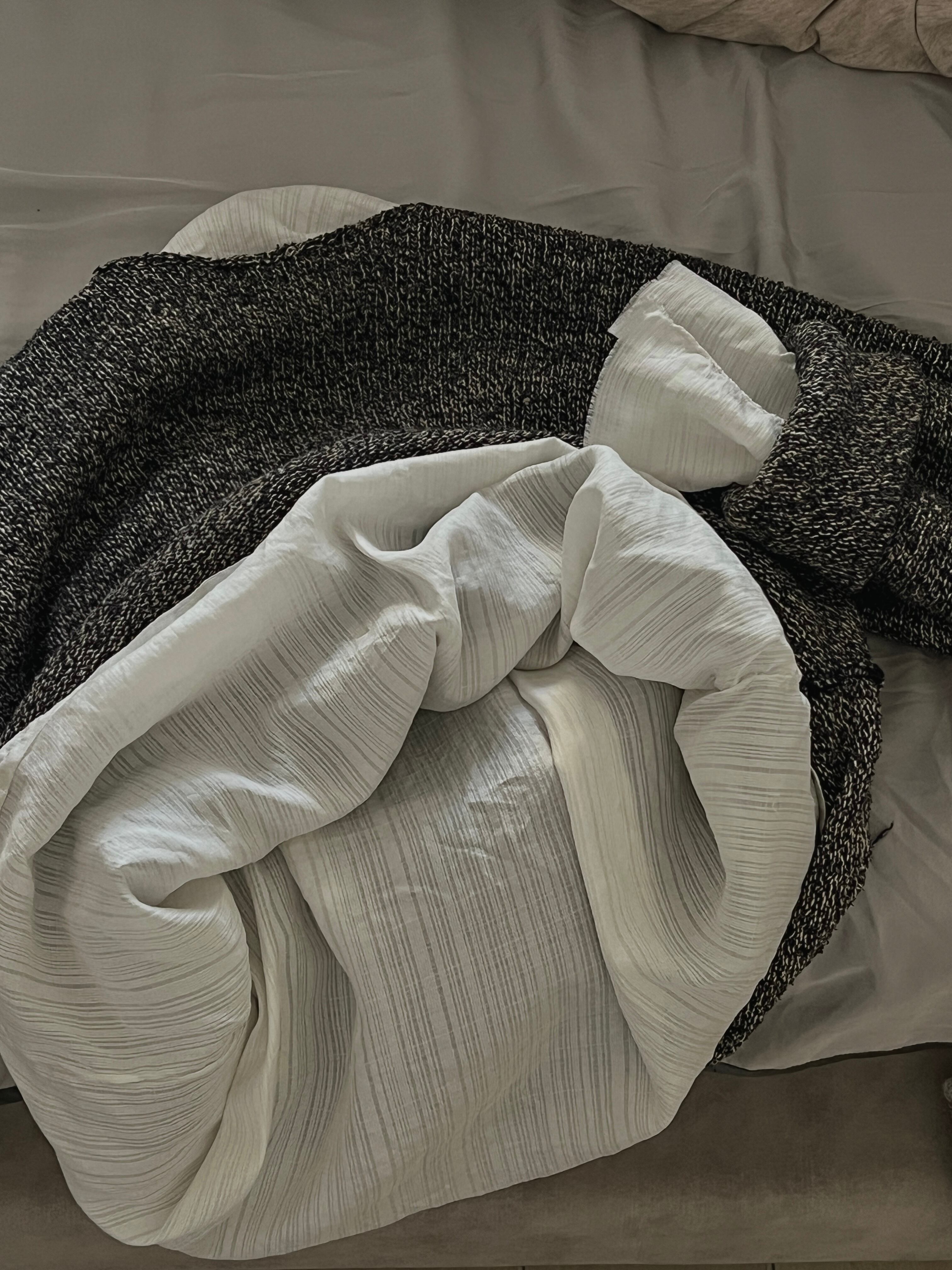 Its texture holds breath, warmth, mistakes, skipped stitches, life.